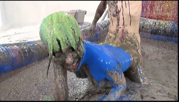 『風雲ウェット&メッシー(WAM)アスレチックランド』という作品のサンプルだと思われます。ビニールプールの中でペンキにまみれて戦います。フェチすぎます。