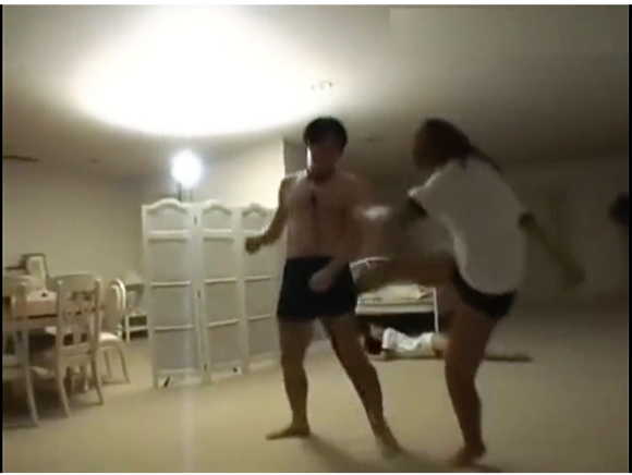 強力な金蹴り、腹蹴りで興奮度が高まりました。特にお互いに立って、向き合っての金蹴りは半端ないものでありました…。